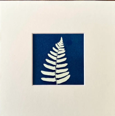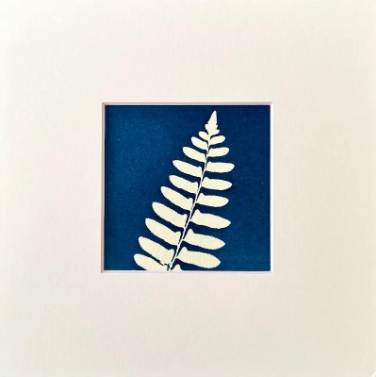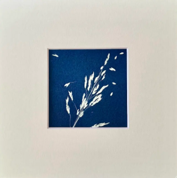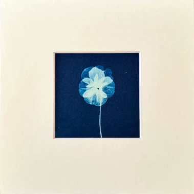 4"x4" original cyanotype on premium watercolor paper inside an 8"x8" mat. This is a one of a kind cyanotype of a pressed and dried cosmos flower, foraged from a meadow just outside Saxapahaw.