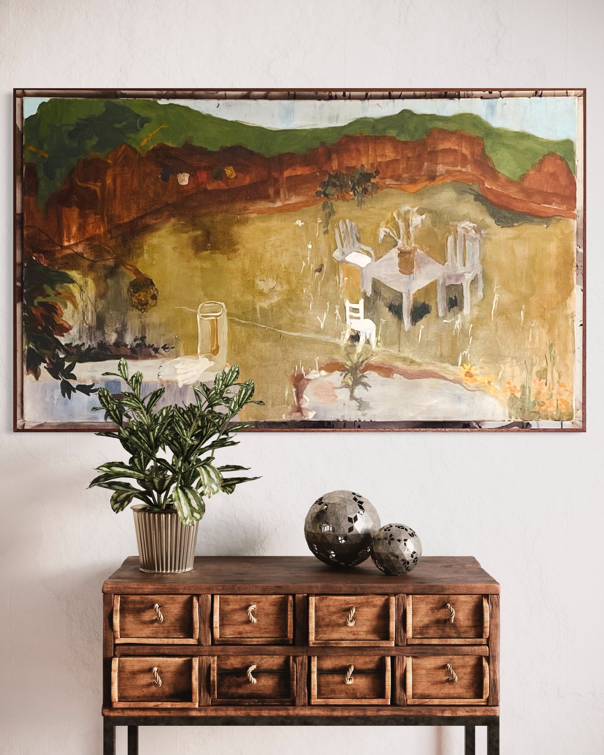 Transform your home decor with this oil painting of a Philadelphia backyard. The bustling city atmosphere is replaced with the stillness of this space. The backdrop of a commuter train beyond the fence is just out of reach for the viewer. A shared table and chair, beckoning the viewer to join the stillness, a space away from the constant buzzy energy of the city.