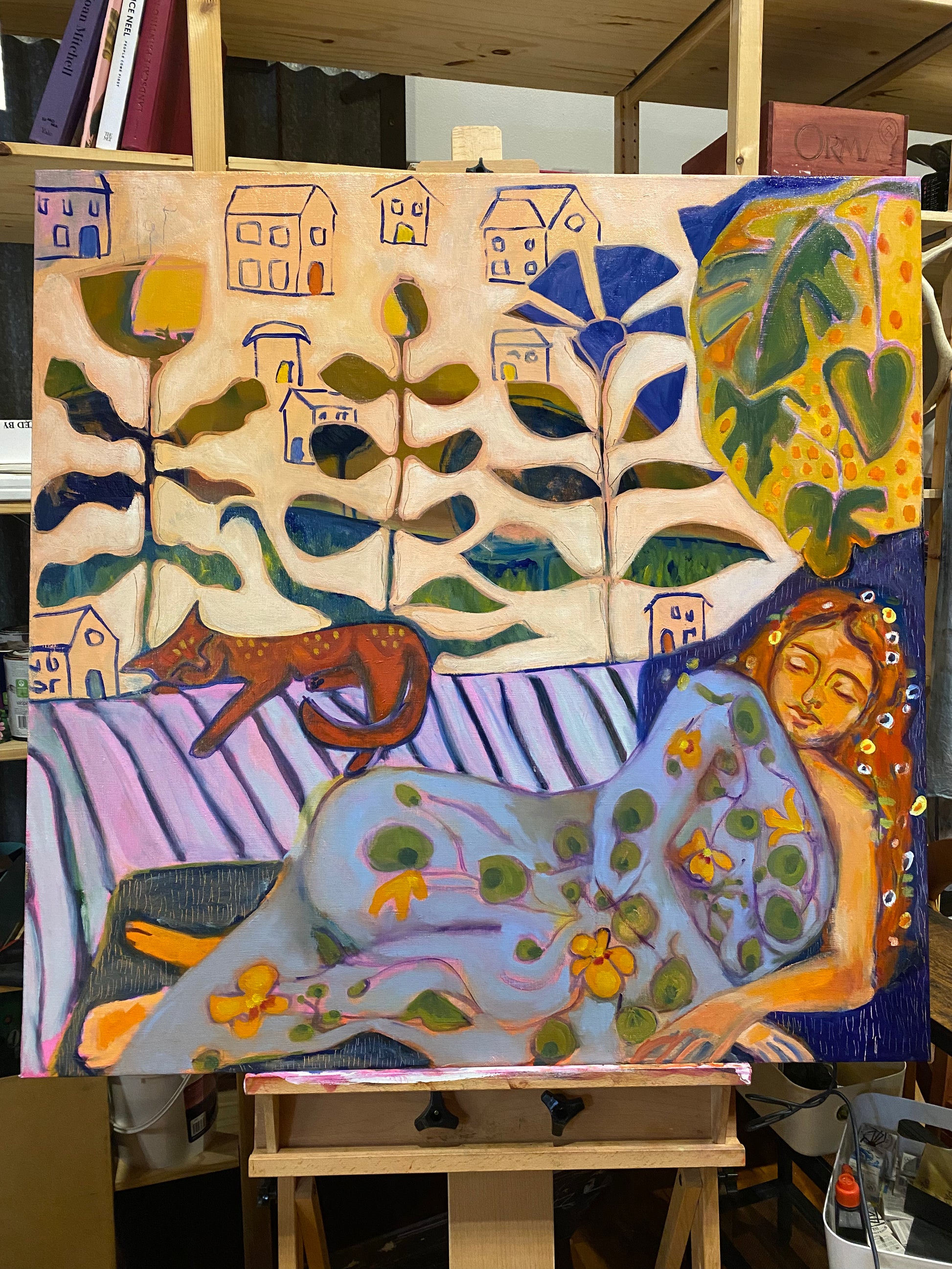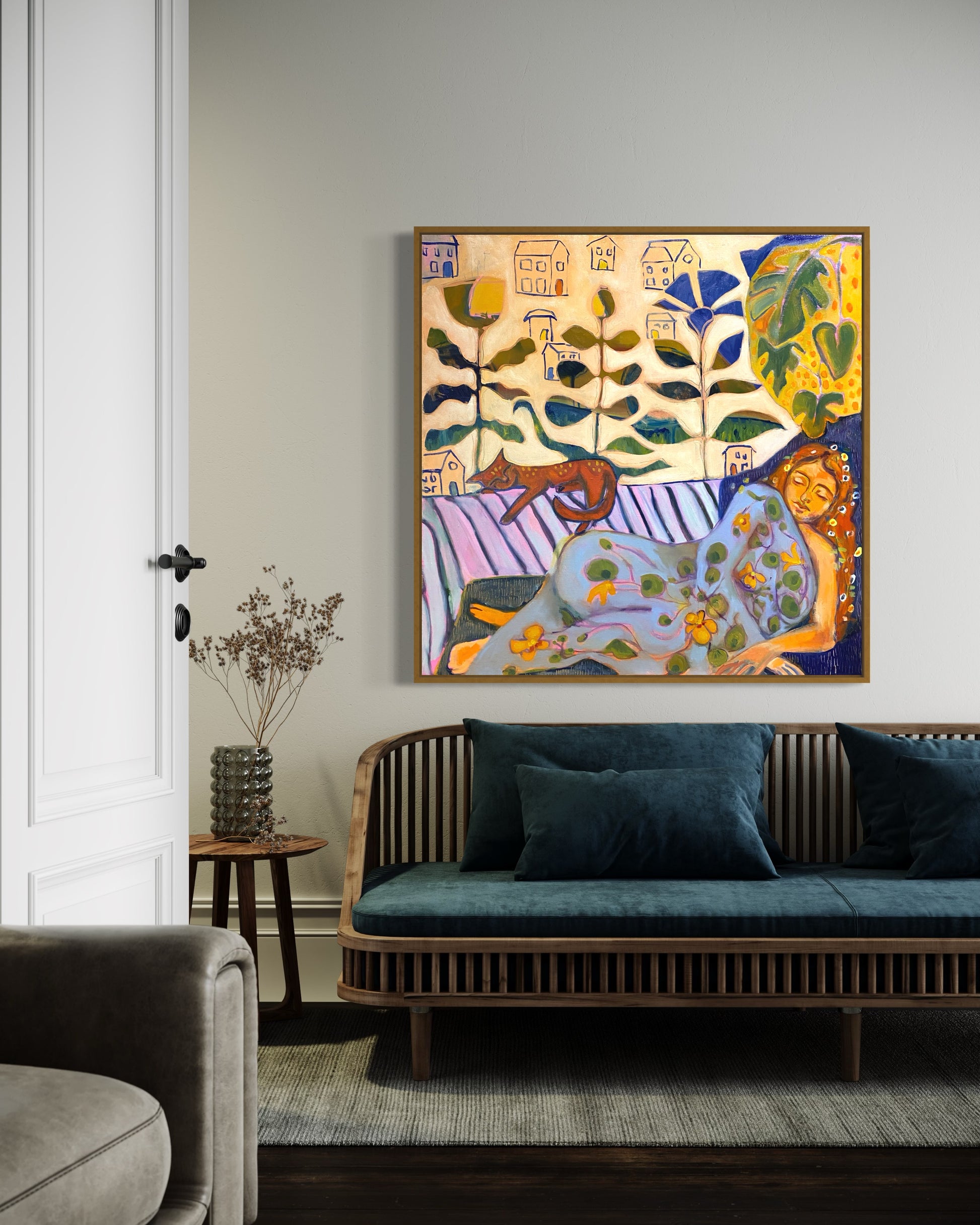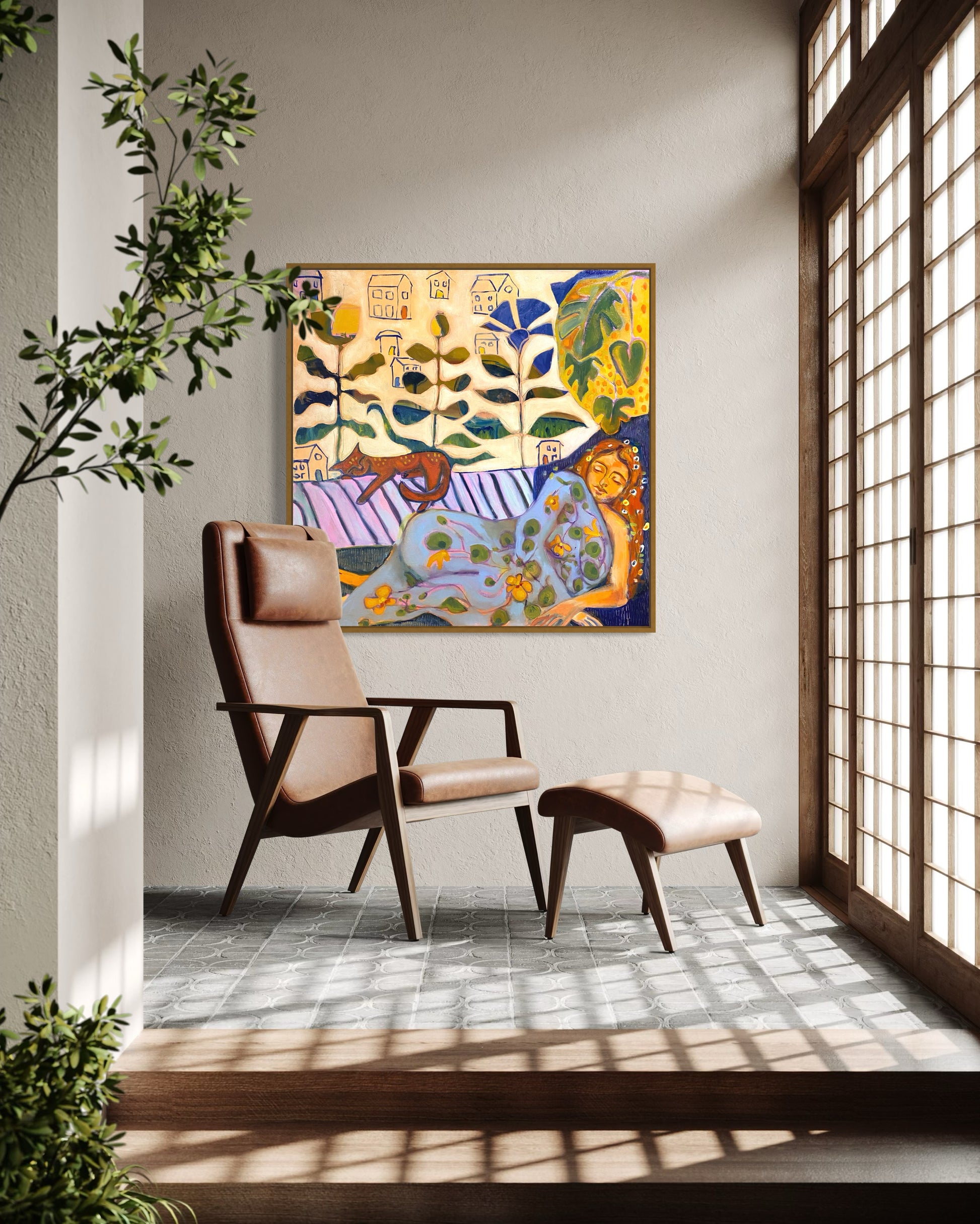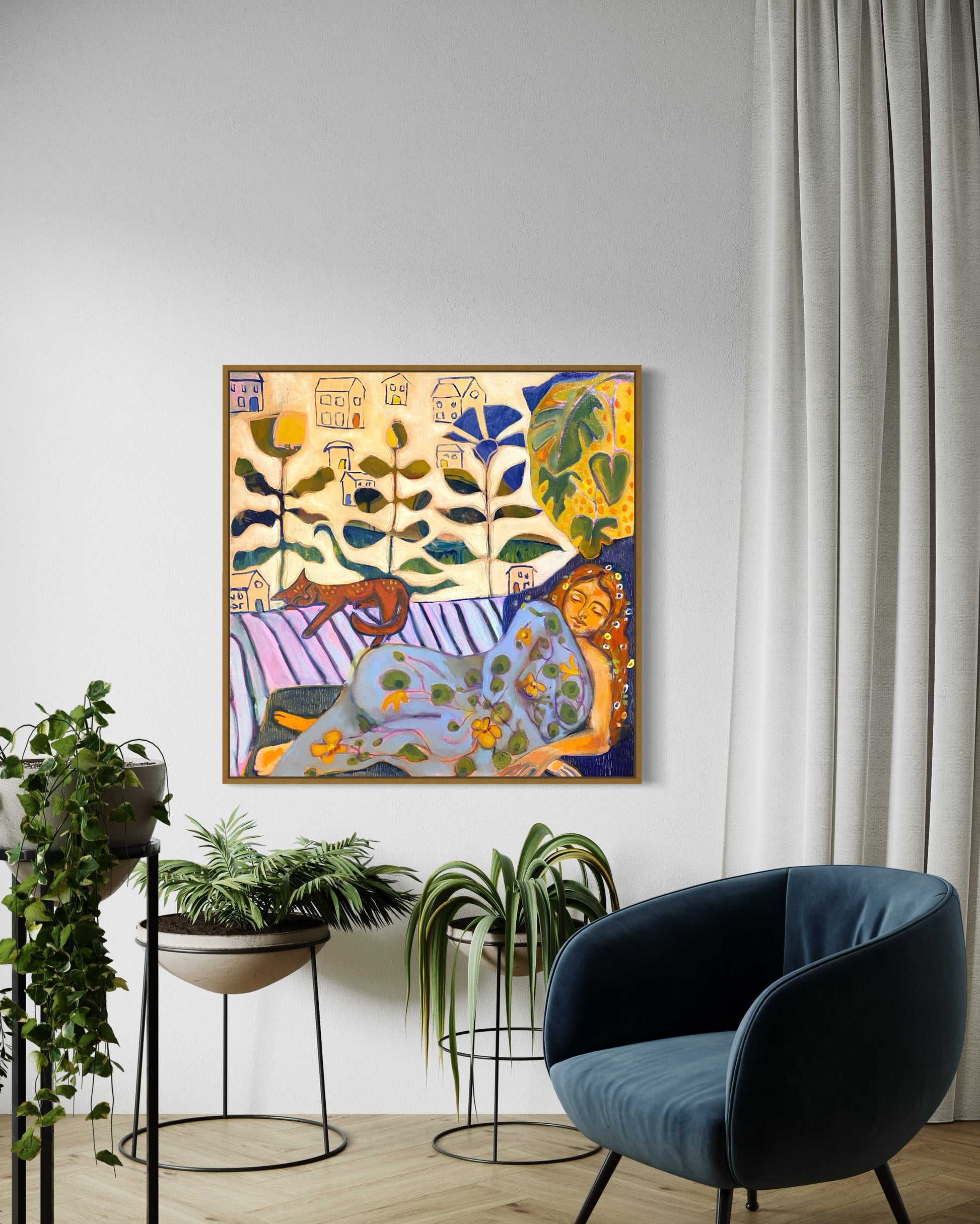 In "Content to Bloom," a woman lounges peacefully on a couch, her faithful cat curled up beside her. Behind them, an abstract town floats dreamily, a surreal representation of the world beyond her tranquil space. From the back of the couch, vibrant flowers bloom and stretch upwards, symbolizing growth and the beauty that comes from being at peace with oneself. The woman, content with her life and her simple pleasures, embodies a serene happiness that allows her to thrive in her present moment. This painting is a celebration of inner peace, the joy found in living your truth, and the quiet strength of being content to bloom where you are.