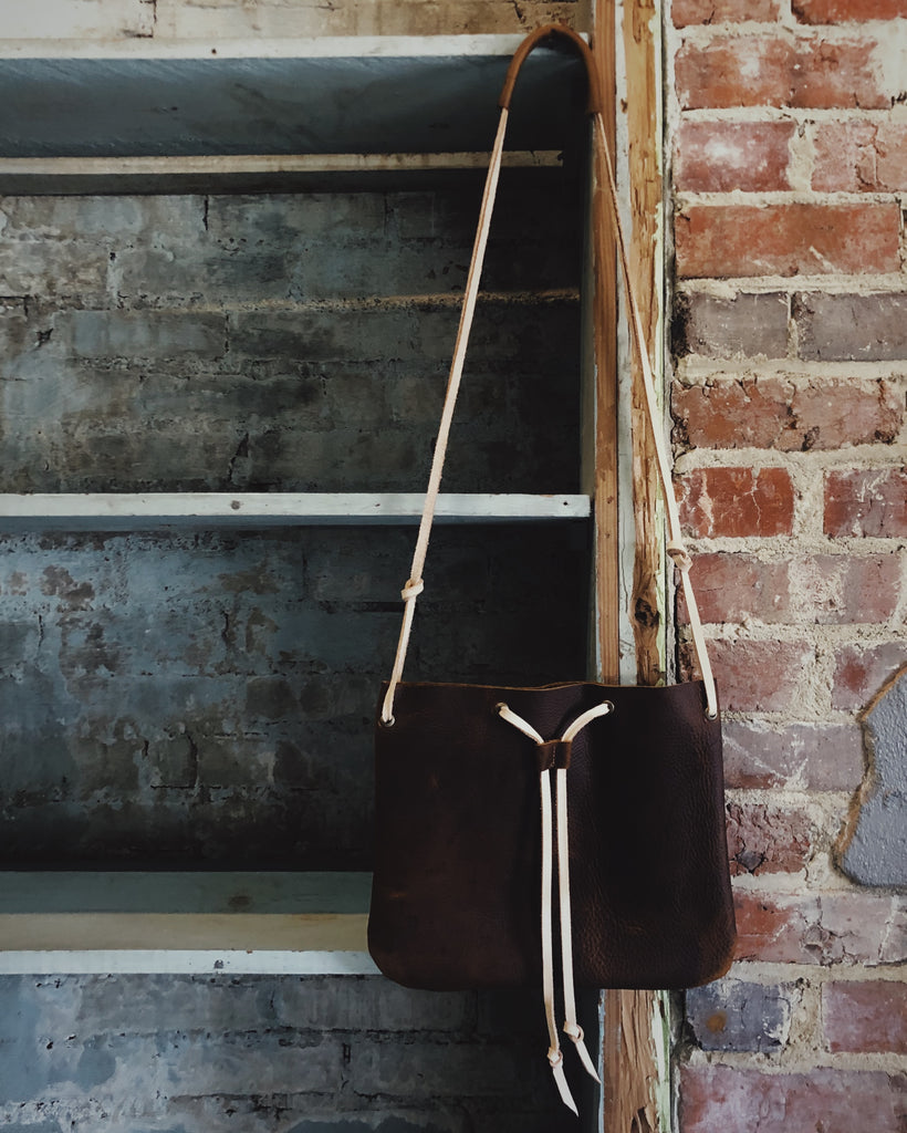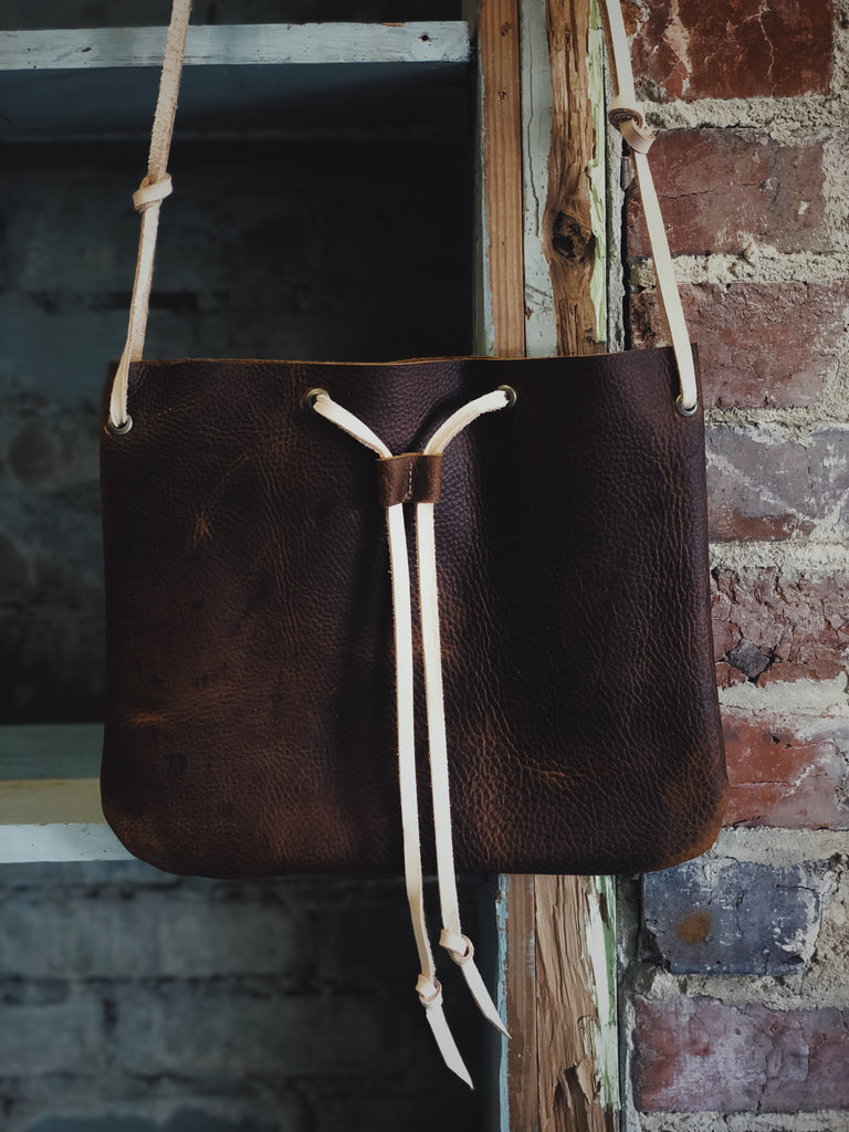 Rustic, strong, and versatile this bag utilizes a drawstring for its closure.