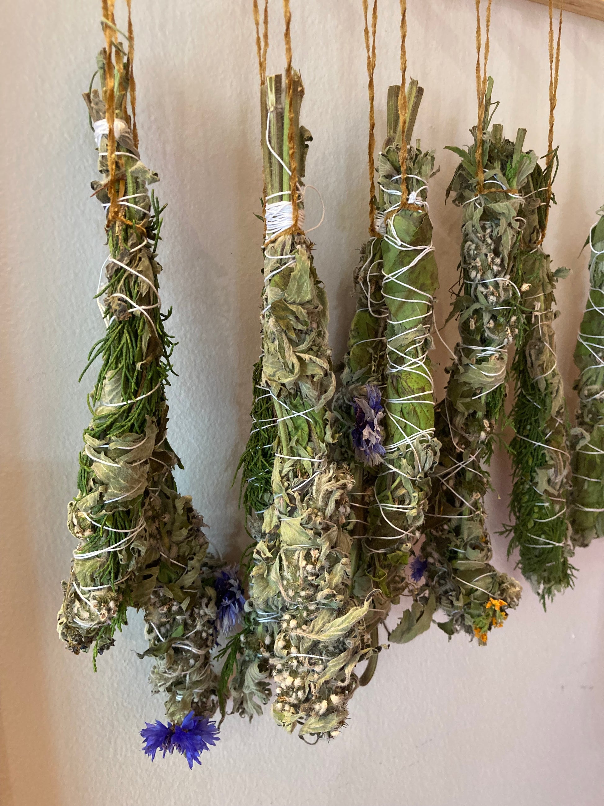 Mugwort, Juniper, Mountain Mint, Batchelor Button, Wall Flower, cotton thread.