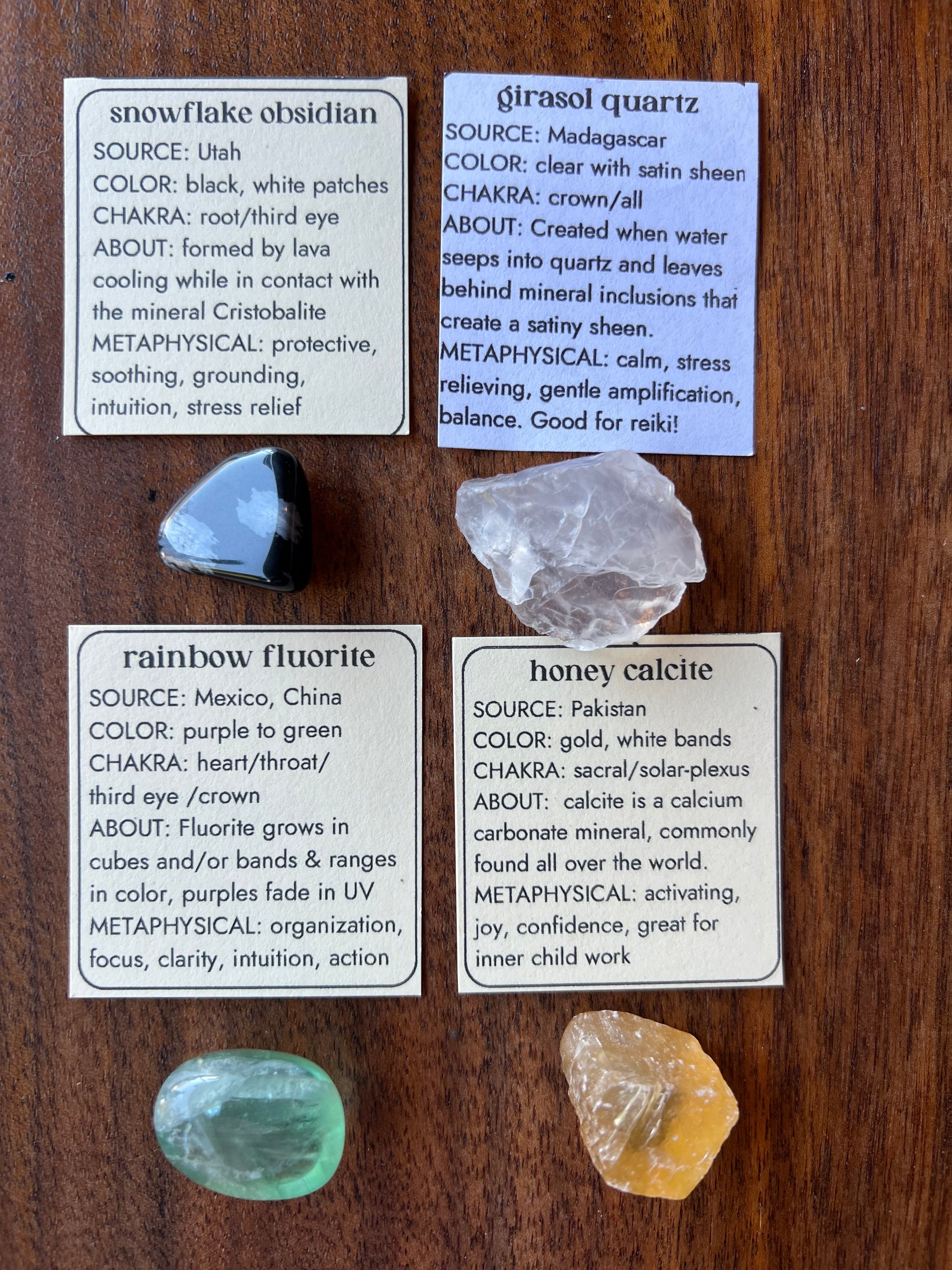 - Snowflake Obsidian, Girasol Quartz, Rainbow Flourite, Honey Calcite chosen for their special meaning described on included cards.