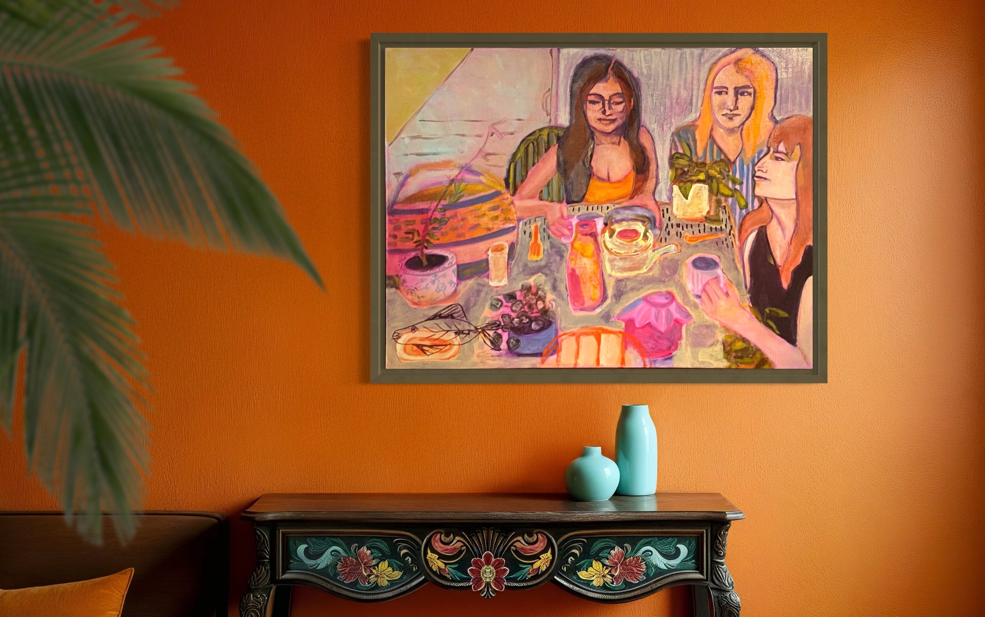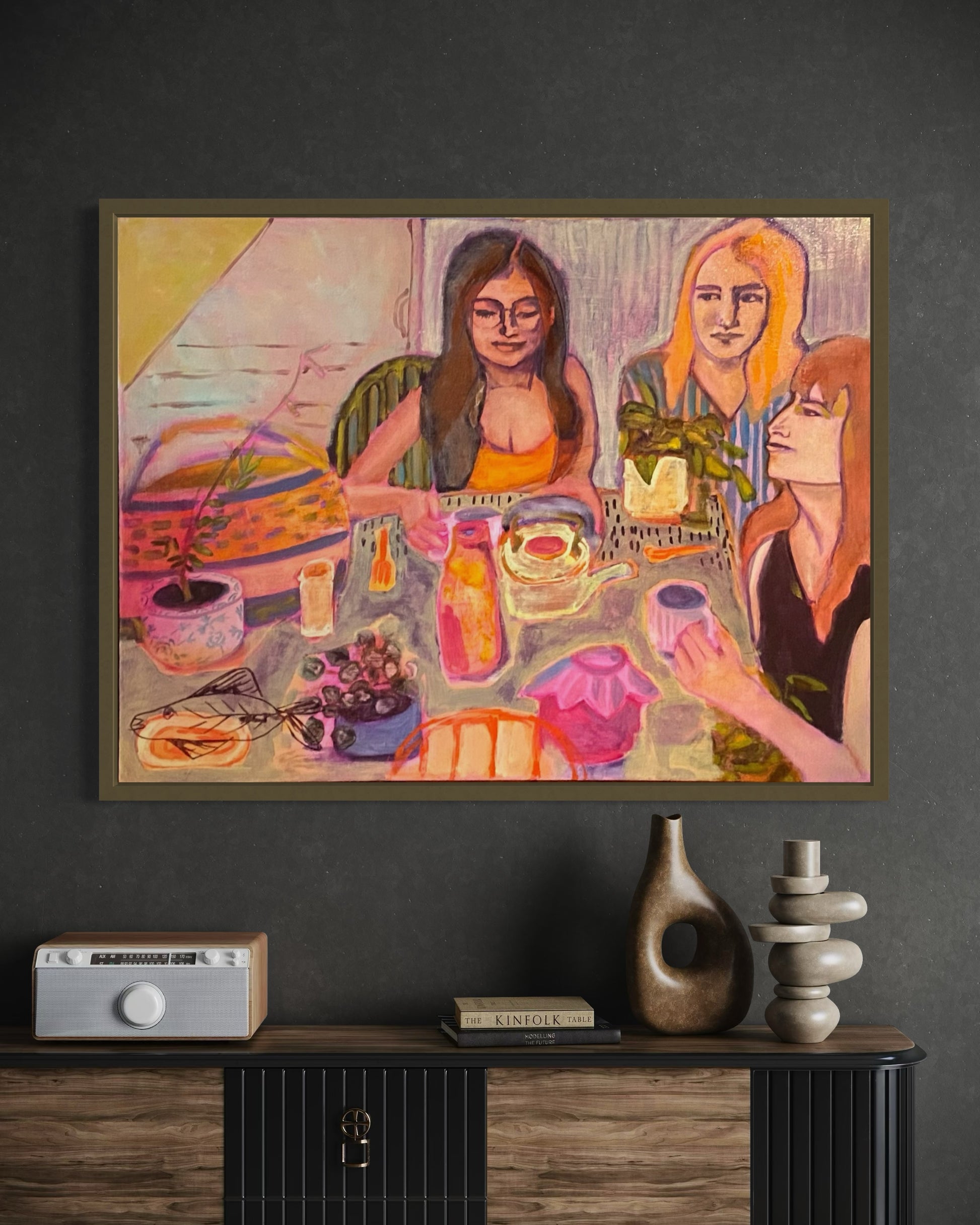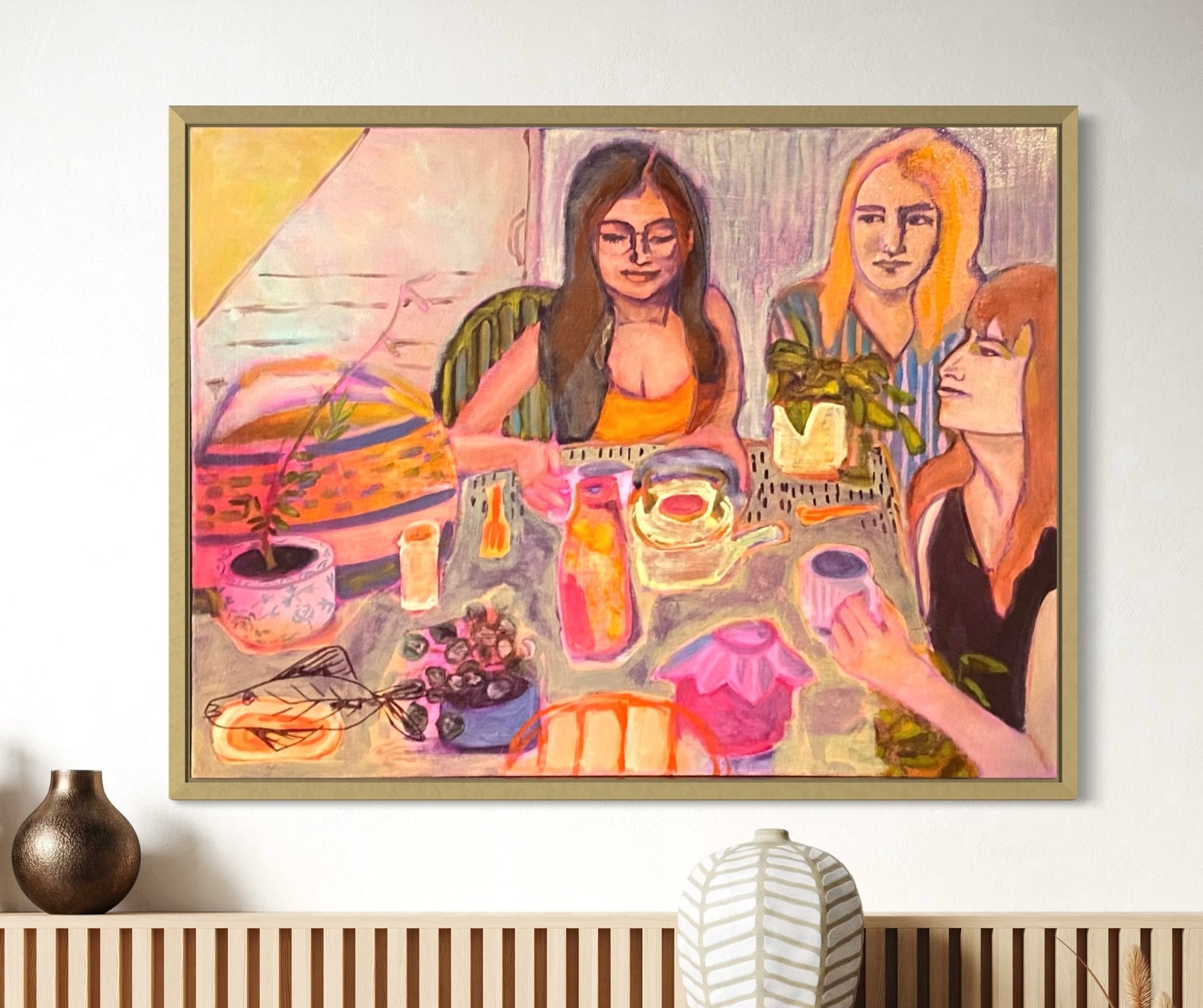 This oil painting captures the warmth and intimacy of a shared gathering. Three women sit together at a dinner table surrounded by abstracted vessels and lush plant forms. Two of the women cradle coffee mugs, while the figure in the center rests her hands gently in her lap, a quiet balance between presence and pause. An empty chair in the foreground creates a sense of anticipation, as though the women are waiting for someone to join, inviting the viewer directly into the scene. With layered textures and soft abstraction, this piece evokes themes of sisterhood, companionship, and the timeless ritual of gathering together.